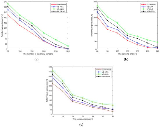 Comparison of moving distance. (a) Results of different number of stationary sensors. (b) Results of different sensing angles. (c) Results of different sensing radius.