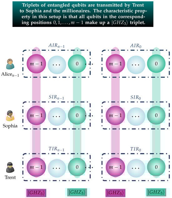 In this composite system, each register holds m qubits. It is important to emphasize that the spatial arrangement of the registers, whether they are co-located or dispersed across various locations, is of no consequence. The entanglement effect derived from the m triplets will produce the required correlations, regardless of whether the composite system is confined to a single area or is fully distributed. This distinctive characteristic of entanglement enables us to conceptualize the entire setup as a cohesive system. Any practical implementation of the GHZ3MQPEC protocol will require Trent to also prepare decoys. This technique is ubiquitous in the literature and is, typically, referred to as the decoy technique. There are many well-written expositions that thoroughly explain the specifics; we refer to [,,,,,,,], to cite just a few. The idea is that if the party responsible for the generation of the entangled triplets also produces decoys randomly chosen from one of the states, it is possible to discover the presence of an eavesdropper. These decoys are randomly inserted into the transmitted sequence(s). We have not mentioned the decoys in Definition 2 to avoid clutter and make the main idea of the protocol easier to grasp.