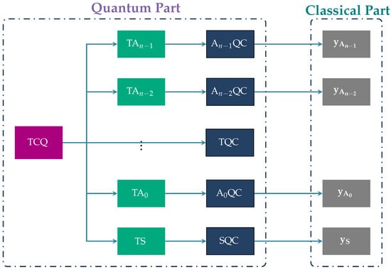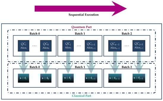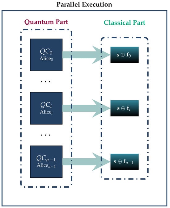 Ideally, assuming sufficient quantum resources, we shall employ a parallel array of n such circuits , as visualized in Figure 4. In case this is not feasible, due to a lack of adequate resources, it is possible to employ these circuits in sequential batches, as we show in Figure 5. All quantum circuits , , are structurally identical, their only possible difference being in unitary transform that embeds Alicei’s fortune into the system. Obviously, if Alicei and Alicej’s fortunes and , , are equal, the corresponding unitary transforms and are the same; otherwise, they are different.