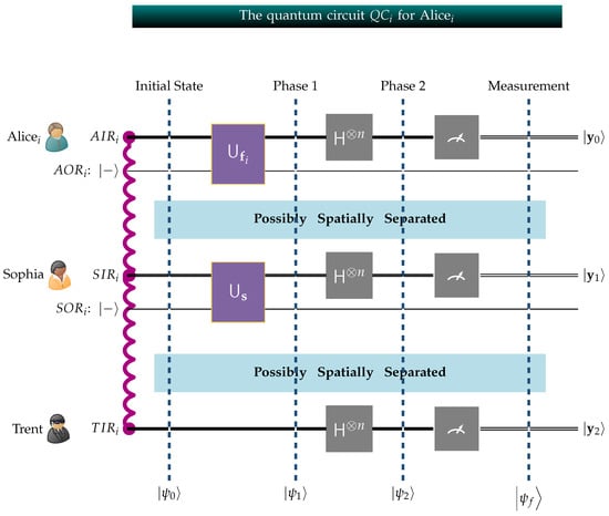 - For every Alicei, Sophia, and Trent, each utilize an m-qubit input register corresponding to Alicei, denoted by and , , respectively.