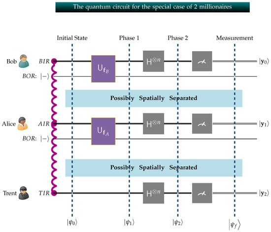 In closing, we briefly mention the special case , which is when there are only two millionaires, say Alice and Bob. As we mentioned in Section 3, in such a case Sophia becomes unnecessary and Trent alone suffices. The GHZ3MQPEC protocol can be easily simplified to function without the presence of Sophia, using the quantum circuit shown in Figure 8. Obviously, the whole mathematical description of the protocol, its quantitative characteristics, and its security remain unaffected.