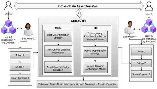 To the best of our knowledge, the proposed work formally defines requirements, a specification, and an asset-specific bridge selection model of a cross-blockchain asset transfer protocol that takes interoperability and transfer confirmations into account with highly secure cryptography solutions under a heterogeneous DeFi system. By selecting asset-specific bridges from the bridge hub, the cross-DeFi supports a variety of asset transfers with high speed and accuracy. Unlike conventional methods that rely on external cryptography solutions, the proposed protocol does not necessitate external solutions. Moreover, it carefully integrates the cryptography solution within the interoperability layer of the blockchain by precisely analyzing its features and adaptability. Table 1 presents a comparative analysis of various cross-chain solutions based on several key parameters critical to blockchain technology’s effectiveness and practical applications. These parameters include interoperability, compatibility with different blockchain technologies, scalability, the necessity of asset-locking during transactions, the ability for direct asset transfers across chains, the use of bridging or oracle solutions, overall transfer performance, guarantee of transaction finality, the complexity of the technology, and the cost of implementation. This comparison highlights the diverse approaches and varying degrees of success these solutions have in addressing the fundamental challenges of cross-chain operations.