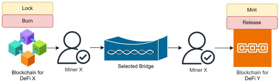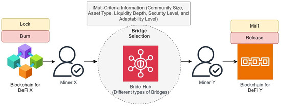 Consequently, generates the proof for the locked asset at . Select the bridge using Equation (1) by sending the proof X to DeFi Y, and the miner verifies whether the received information is true or not. If it is true, the locked asset valued at X is credited in the at DeFi Y.
