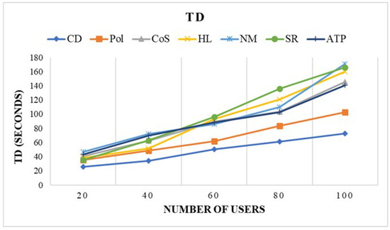 Figure 8 and Table 10 compare TD across the same set of cross-chain solutions as user numbers increase. This TD is estimated by the summation of both transfer time and transfer confirmation time. CrossDeFi shows an incremental delay from 25.6 s with 20 users to 72.5 s with 100 users. Despite this increase, CrossDeFi consistently maintains lower delays compared to its competitors. This efficiency is largely due to its optimized miner and asset-specific bridge selection algorithms, which effectively reduce delays and transaction fees while enhancing security. The asset-specific bridges selected by CrossDeFi significantly boost transfer speeds and ensure timely delivery of transfer confirmation messages, leading to improved asset transfer rates. For instance, delays observed for CrossDeFi, Pol, CoS, HL, NM, SR, and ATP are 72.5 s, 102.6 s, 145.7 s, 160.1 s, 170.9 s, 165.8 s, and 140.4 s, respectively, for scenarios with 100 users.