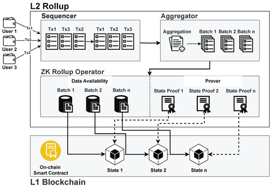 Using zk-proofs, zk-rollups enhance scalability and privacy by allowing off-chain nodes to prove the validity of transactions without revealing any detail. The results of transaction executions are compressed into a single batch and stored in the L1 blockchain together with a cryptographic proof of state transition, as illustrated in