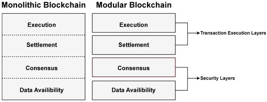 The traditional monolithic blockchains are designed with a single layer that handles the transaction execution, consensus, data availability, and settlement. However, this tight integration has led to issues such as low throughput, scalability, and transaction cost. For instance, Bitcoin has low transaction throughput, and Ethereum has high Gas prices. These challenges led to a novel modular blockchain design with separate layers for execution, consensus, data availability, and settlement [