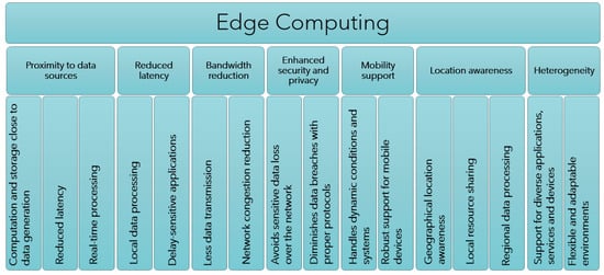 The main characteristics of edge computing that are mentioned in several literature surveys are highlighted below (see Figure 1):