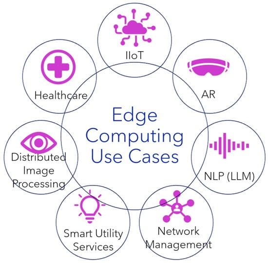 For computer vision, most applications focus on object detection and image processing, which can benefit significantly from edge computing [,]. By processing data locally at the network edge, bandwidth is reduced without the need to upload sensitive data and this motivates the approach from a scalability perspective as well. Edge devices for smart utility services are capable of reporting finer-grained energy consumption details directly to user’s mobile devices and offering suggestions on choosing the most economical energy source and optimal times to operate high-consumption home appliances to minimize usage and cost []. For Augmented Reality (AR) and cognitive systems, deep learning can be utilized to detect objects in the user’s field of view and apply virtual overlays. By processing these tasks on edge devices, AR systems can significantly reduce the motion-to-photon latency, enhancing user experience by ensuring timely and responsive virtual overlays. For example, splitting the data into time-sensitive and non-time-sensitive, offloading the first category to edge devices and handling the latter on fog or cloud layers, improves the system’s overall response and effective assistance in real time []. For network management, Intrusion Detection Systems (IDSs) actively respond to detected attacks by blocking malicious packets by using deep learning algorithms, thus having the ability to analyze large volumes of network traffic and identify anomalous patterns indicative of potential threats in an ultra-low-latency environment []. Another application is in-network caching, which reduces the need for repeated data transfer over long distances, thereby lowering latency and network concentrations []. Edge computing plays an important role in Natural Language Processing (NLP) applications, particularly for voice assistants on mobile devices and conversational AIs. These assistants use on-device processing to detect wake words which trigger further processing and use cloud connection only when necessary. Edge-based NLP solutions address latency and privacy concerns, thereby enhancing user experience, efficiency, and data privacy [].
