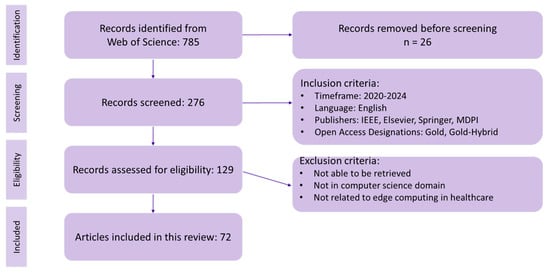 The next phase is Screening, where we apply specific inclusion criteria for our study to further filter the results and narrow them to a total of 276 papers. Here, we applied filters by limiting the timeframe to 2020–2024, focusing on the top four publishers and including only open access articles. In the Eligibility phase, we apply new exclusion criteria, which drops the total number of papers for our study to 72. Here, manual tunning was performed to remove papers that were not able to be retrieved (freely or through institutional access for subscription-based accessing) or that were not in the computer science domain or not connected with the edge computing in the healthcare sub-domain. A detailed view of the inclusion and exclusion criteria can be found in Table 1.