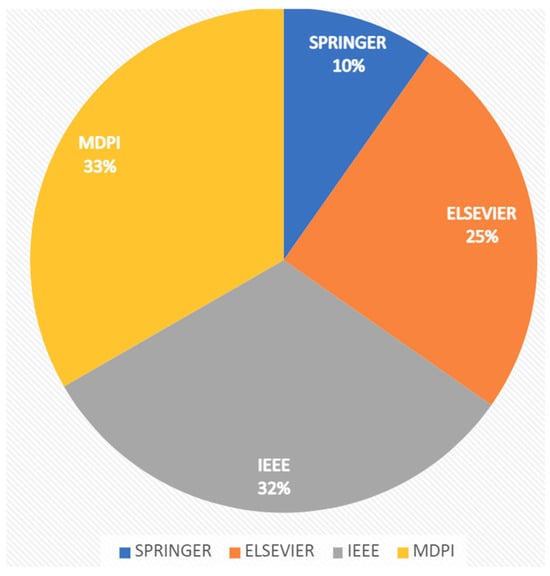 Figure 6 shows a classification of the included articles considering the publisher. The results show that MDPI (33%) is the main publisher of edge computing in healthcare-related articles, closely followed by IEEE (32%) and Elsevier (25%).