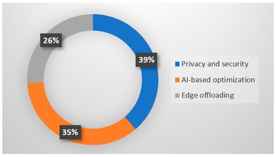 The 72 selected research papers have been analyzed and further classified according to three main research areas (see Section 4): (i) privacy and security, which describes the proper handling of personal and sensitive information, and the significant security concerns in the context of edge computing; (ii) methods for improving efficiency and optimizing techniques in edge scenarios; and (iii) offloading computational distribution, which refers to the process that aims to reduce latency and improve overall computational performance. The distribution of the papers in these three research areas and per quartile can be seen in Figure 8. The classification shows a high interest in the data privacy and security of edge computing solutions applied to healthcare (39%), while similar attention is given to the AI optimization techniques (35%) and a rising interest in computational load distribution and offloading direction, especially in the context of federated learning scenarios (26%).
