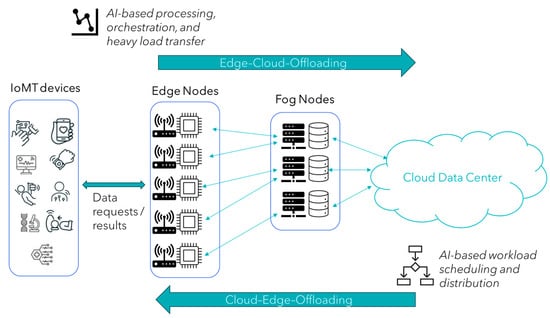In healthcare, edge computing can help to detect, predict, and prevent health problems by dynamically deploying Artificial Intelligence (AI) algorithms across edge devices that will support low latency, mobility, location awareness, and privacy considerations [,]. Edge computing is driving the transformation of the healthcare sector by bringing data processing and analysis closer to the point of data generation, whether in hospitals or patients’ homes (see Figure 3). Bringing computation and data storage closer to the patient will offer various benefits to the entire sector: