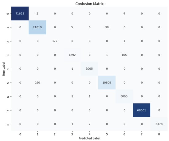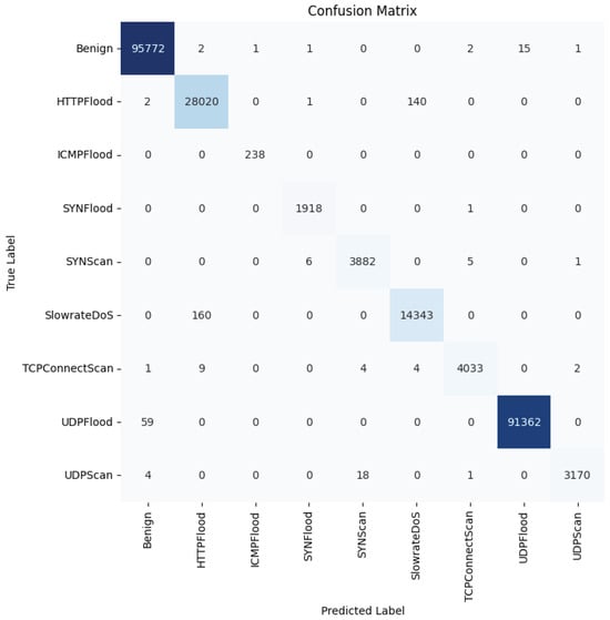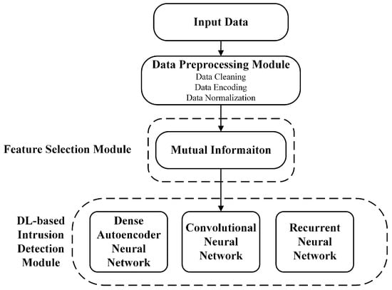 The performance of the proposed DL-based intrusion detection framework was evaluated using several metrics, including testing accuracy, precision, recall, and F1-score, calculated as shown in the equations below [,]: