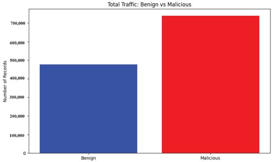 The dataset comprises 1,215,890 data points, with 477,737 representing benign activities and 738,153 representing various malicious activities, as shown in Figure 2. This indicates that the dataset is fairly balanced. This is in contrast to typical intrusion detection datasets, which are often imbalanced, as they have many more normal/benign data points compared to malicious/attack data points [,]. Each data point includes 112 collected and encoded features. The malicious activities encompass various attack types, including denial-of-service (DoS) attacks (e.g., ICMP flood, SYN flood, HTTP flood) and port scan attacks (TCP scan and UDP scan).