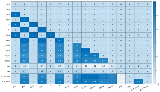 An initial data cleaning process was conducted for the dataset, where duplicate entries were removed. Additionally, a few rows belonging to the benign class were dropped from the dataset, due to a significant number of missing values across various columns. Similarly, certain columns (sVid and dVid) were removed, as they were deemed extraneous to the analysis. Additionally, missing values in each row were replaced with the most frequent value (mode) within each group, as determined by the attack type column, using a custom function. The mode was selected as the imputation method because each of the columns had a low number of unique values (often only 6–7 different values). This indicated that the data were categorical or ordinal in nature. Utilizing the mode in this instance preserved the categorical nature of the data, while avoiding the introduction of additional values that may not be representative of the original data distribution. For a subset of columns, an iterative imputer (MICE) was employed to handle any remaining missing data. Figure 3 depicts the degree of correlation between columns with missing values. More specifically, the figure shows the relationship between features that have missing values, to determine how often they both have a missing value at the same time. For example, it can be seen from the figure that the feature sTos had a correlation value of 1 with sDSb, sTtl, and sHops. This means that every time sTos had a missing value, the features sDSb, sTtl, and sHops all had missing values as well. This was expected, since all these features are related to the data traffic source. Hence, if the system was unable to collect a value for one of them, it would not be able to collect a value for any of them. In a similar fashion, the feature dTos had a correlation value of 1 with dDSb, dTtl, and dHops. Again, this meant that every time dTos had a missing value, the features dDSb, dTtl, and dHops all had missing values. This gave us a better understanding of the relationship that existed between the different features collected and helped us better select features in the “feature selection module”.