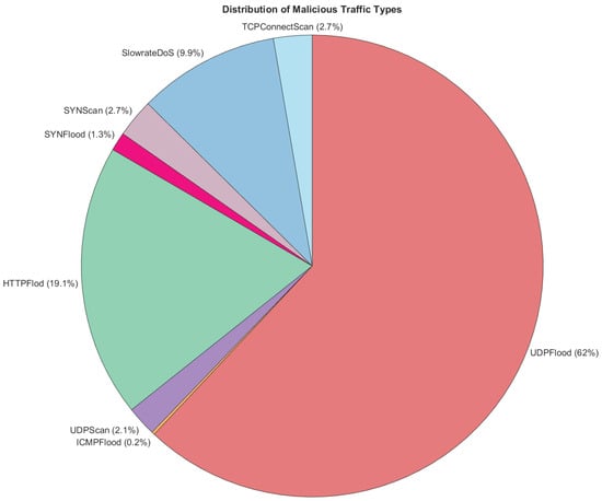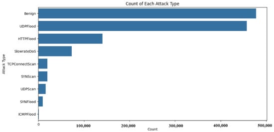 As part of the exploratory data analysis process, several steps were taken. Starting off with a simple counting, Figure 4 and Figure 5 outline the number and percentage distribution of malicious attack instances. It can be seen that the top attack types were UDPFlood and HTTPFlood, which are common distributed denial-of-service (DDoS) attacks. This mimics real-life attack patterns, with a recent report conducted by QRATOR labs indicating that UDP flood attacks constituted 60.2% of DDoS attacks in 2023 []. Similarly, the report stated that other flooding attack patterns such as IP flood (similar to HTTP flood) and SYN flood accounted for roughly 23% of attacks. This reinforces the realistic nature of the 5G-NIDD dataset generated in [].