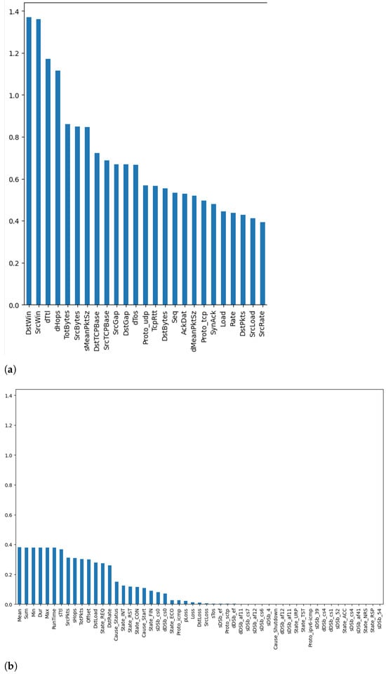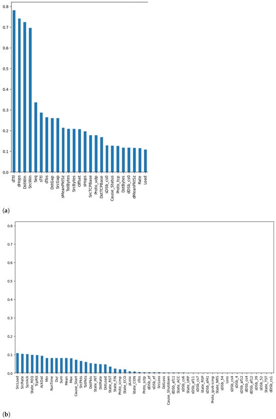 The next step was calculating the mutual information score of the different features with respect to the class label. Figure 6 and Figure 7 plot the mutual information score for the binary (i.e., benign or malicious) and multi-class (i.e., categorized by attack type) cases, respectively. More specifically, Figure 6a and Figure 7a represent the top 25 features, while Figure 6b and Figure 7b represent the remaining features for the binary and multi-class cases, respectively. It can be seen from these figures that the top features for both cases were destination time-to-live (dTtl), number of hops to destination (dHops), destination window (DstWin), and source window (SrcWin). The only difference was is the order. This implies that, from a holistic point of view, features such as dTtl and dHops provided more insights into whether the instance was an attack or not. However, when delving deeper into the data and trying to determine the attack type, features such as DstWin and SrcWin were better capable of determining the attack type, as they provide more information about it. These visualizations give us insights into the potential impact of these different features on the overall performance of the underlying DL models that are used for intrusion detection and attack classification.