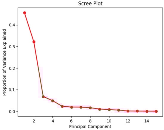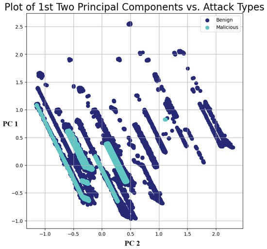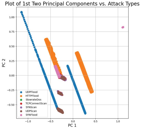 To further explore the data, a principal component analysis was conducted to obtain insights into the overall distribution of the data per class. Figure 8 and Figure 9 plot the 1st and 2nd principal components for the binary and multi-class cases, respectively, while Figure 10 plots the importance of each principal component. As can be seen from Figure 8 and Figure 9, the data were highly non-linear. This was expected, since network traffic data often exhibit non-linear trends, as observed in multiple previous works [,,,]. This again further highlights and emphasizes the need for ML and DL models that can effectively and efficiently deal with non-linear data. Thus, the choice of using DL models such as DNN with autoencoders, CNNs, and RNNs was justified. Additionally, the choice of plotting only the first two principal components was justified by the results shown in Figure 10, which illustrate that these two components explained nearly 80% of the variance within the data.