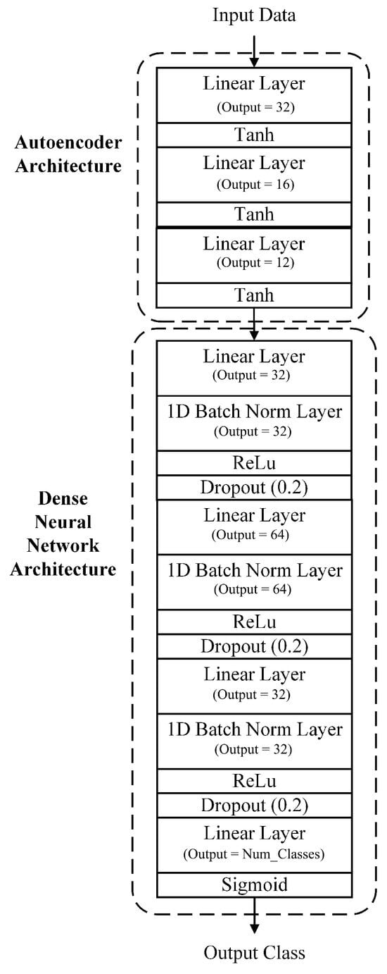 - Dense Autoencoder Neural Network Model: The first DL model is the dense autoencoder neural network model. This model uses an autoencoder to enhance a dense neural network (DNN) model. An autoencoder is a type of unsupervised deep learning model that uses a combination of backpropagation and compression to reconstruct an output as accurately as possible [,]. It allows for an accurate latent representation of the original features, while minimizing the effects of linearity [,]. On the other hand, a DNN is a fully connected supervised learning neural network model, in which each neuron in each layer is connected to every other neuron in previous and subsequent layers []. The autoencoder component is used for feature extraction, while the DNN component learns the characteristics for accurate prediction. Hence, this model leverages the power of DL to learn complex patterns and representations from the input data, while reducing its dimensionality, thereby improving the computational efficiency and generalization performance.