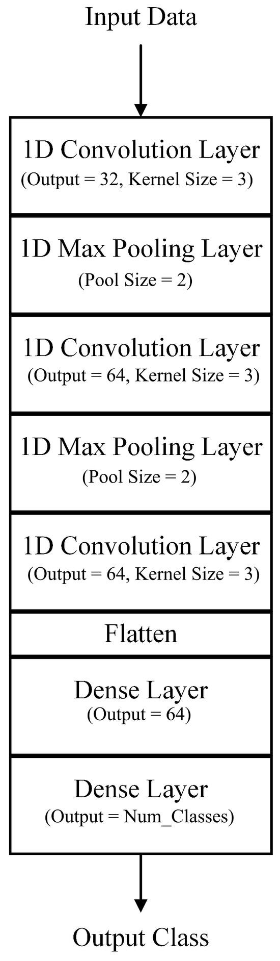 - Convolutional Neural Network Model: The second DL model considered is the convolutional neural network (CNN) model. CNNs are a type of feedforward neural network that can extract features using convolution operations [,]. Convolution operations are basically an inner product computation between the weight vector and the vectorized version of the input feature set of the previous layer in the neural network architecture []. The advantage of CNNs compared to other deep neural network models are threefold, namely allowing for local connections, which eliminates the need for a fully connected architecture; facilitating weight sharing, which reduces the number of parameters to be determined; and achieving dimensionality reduction by using a pooling layer to reduce the amount of data needed, while retaining useful information [,,]. This makes them a reliable and attractive option for many applications and fields.