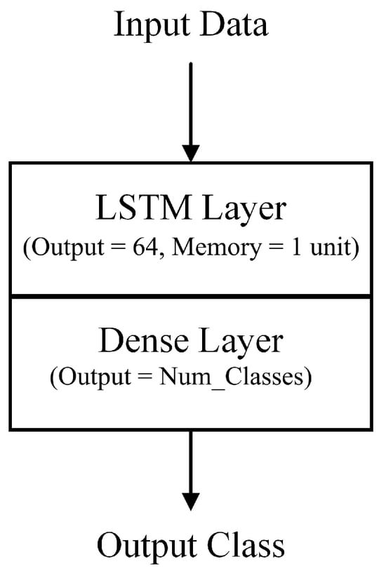 - Recurrent Neural Network Model: The third DL model considered is the recurrent neural network (RNN) model. RNNs are a feedforward neural network architecture with at least one feedback loop [,]. The goal is to achieve some form of “memory” regarding the learning process [,]. Consequently, RNNs are able to perform “temporal processing” and “learn sequences”, i.e., they are capable of dealing with time-sequence data and can identify patterns that repeat over time [,]. This represents an advantage over other DL-based models and architectures, as they are able to not just learn patterns within a data sample, but also across several sequential data samples []. This makes them suitable for a variety of applications, such as natural language process, audio and video data processing, stock prediction, and cybersecurity [].