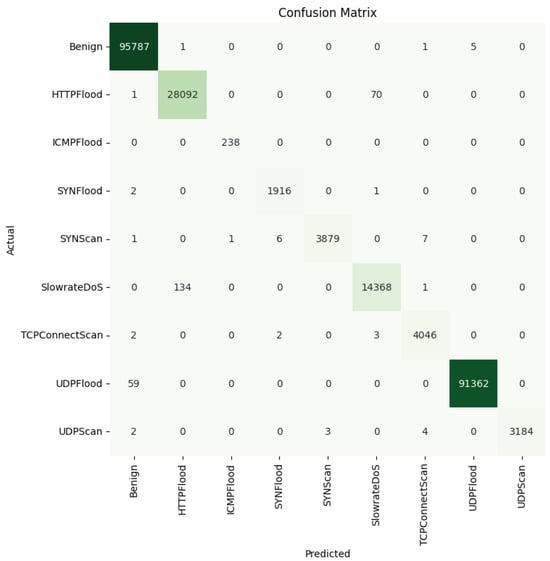 To further study the capabilities of the DL models in detecting the different attacks, Figure 14, Figure 15 and Figure 16 provide the confusion matrices for the dense autoencoder neural network, convolutional neural network, and recurrent neural network models, respectively. These figures provide insights into the detection capabilities of the DL models when it comes to detecting specific attacks. Most of the misclassification cases occurred between specific pairs of attack types that exhibited similar characteristics. For instance, the HTTPFlood attack mimics human behavior by generating a large volume of seemingly legitimate requests, which can lead to confusion with other attack types. Similarly, in SlowRateDOS attacks, a large volume of malicious activities occur, but at a slower pace. This potentially causes misclassification due to their subtle nature. Additionally, discrepancies can arise between SYNFlood and TCPConnectScan attacks, particularly in their request patterns. In SYNFlood attacks, the third request (ACK bit) is typically skipped, whereas it is sent in TCPConnectScan. Consequently, the first two requests in both attack types may exhibit similar characteristics, leading to misclassification. These nuances highlight the challenges inherent in accurately distinguishing between attack types and underscore the need for further refinements in feature extraction and model architecture to enhance the classification accuracy in 5G networks.
