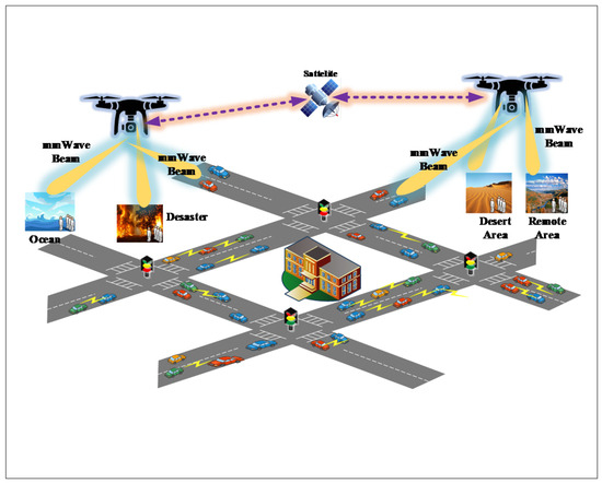 In the context of Intelligent Transportation Systems (ITSs), the integration of satellite communication, mmWave roadside units, and connected vehicles present a multifaceted communication scenario, as illustrated by Figure 1. Satellites play a crucial role in providing wide-area coverage and connectivity for ITS applications, offering a reliable communication link that can support data exchange over vast geographical areas [6]. When combined with mmWave roadside units, which enable high-speed and low-latency communication at close proximity to the vehicles, the system enhances real-time data transmission, such as traffic updates, navigation information, and safety alerts [7]. Connected vehicles within this framework benefit from seamless connectivity and information exchange, enabling them to receive and transmit critical data for optimal navigation, collision avoidance, and overall traffic management in the intelligent transportation ecosystem. This integrated setup leveraging satellites, mmWave roadside units, and connected vehicles showcases a promising communication infrastructure for enhancing the efficiency, safety, and intelligence of modern transportation systems [8].
