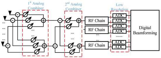- Choi, J.; Lee, G.; Evans, B.L. Two-stage analog combining in hybrid beamforming systems with low-resolution ADCs. IEEE Trans. Signal Process. 2019, 67, 2410–2425. [Google Scholar] [CrossRef]