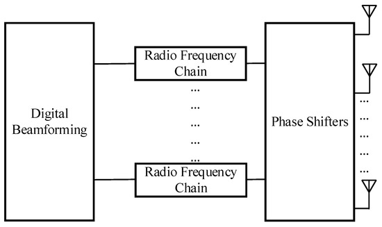 For multi-user MIMO communication in uplink, the hybrid beamforming method is used to reduce inter-user interference in which the analog and digital beamforming step are implemented. The Gram–Schmidt technique with low complexity can handle the analog step matrix, and the small dimensional effective channel MMSE can be used to obtain the digital beamforming matrix. Figure 5 depicts the unit cell architecture in which the base station is connected with N quantity of antennas and NRF radio frequency chains such that the quantity of radio frequencies chains is less than number of transmitting antennas. When the number of radio frequency chains and phase shifters are equal, which is known as a fully connected architecture, the base station with a single antenna and user are served simultaneously and highly synchronized. Each phase shifter is connected with an adder and then connected with antenna through the amplifier which enhances the signal strength. This hybrid method has a large performance benefit over the existing ones and is robust enough to tolerate severe inter-user interference with low complexity, having a performance near to fully digital [45].