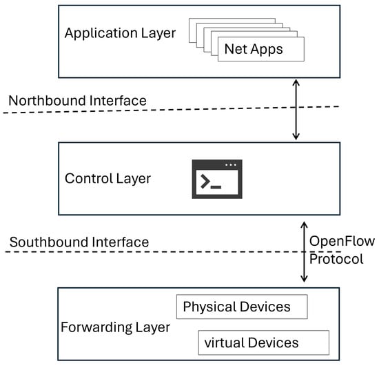 In recent years, SDN has attracted the interest of the research community and industry due to its potential for evolution, the development of new ideas, and the innovation of the network. The SDN architecture includes three distinct layers: (a) the data layer; (b) the control layer; and (c) the application implementation layer for network programming. This architecture provides many new possibilities and opportunities for future networks. A typical SDN architecture is depicted in Figure 1. The data layer includes the underlying network equipment (called switches []) and has as its main task the distributed forwarding of packets. The hardware independence and programmability of the data plane enable the switches to perform the desired but complex packet-switching functions. However, the control plane, a logically centralized and rich entity called controller, defines how the data must be handled. The controller usually has a wide set of modules, interacts with a collection of network applications, and has a global view of the network. The controller regulates the whole operation of the network. Thus, it makes decisions on the configuration of data traffic, defines the way of transmitting data, and allows real-time control of existing devices. The communication between the controller and application layer is achieved using the Northbound Interfaces and the communication between the controller and the network devices is realized through the Southbound APIs and the use of the OpenFlow protocol.