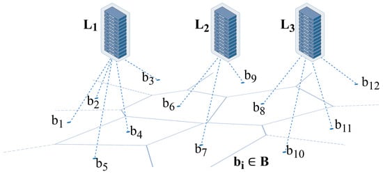 Figure 1 depicts an example of the EDC placement problem, where we can see that EDC manages a group of base stations: . Therefore, we need to determine the optimal placement of among the base stations to minimize access delay. Along with solving this problem, it is also crucial to define the dominant area of each EDC to achieve a balanced workload.