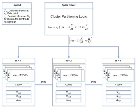 K-Means aims to minimize the sum described in (1) across all clusters. In Spark, this can be efficiently executed across the computing cluster by representing dataset D as a DataFrame and, for each data point, , determining the closest centroid, , as we can observe in Algorithm 1. This operation is distributed across the partitions of the DataFrame, where each partition computes the closest centroid for its subset of data points and, after assigning all points to their closest centroids, recomputes the centroids by making a generalization of the centroids of each cluster. This involves filtering the DataFrame by cluster assignment (i.e., grouping by cluster ID) and then calculating the mean of the points in each cluster. In Spark, this is achieved through a combination of groupBy and aggregation operations over the DataFrame. Finally, the WCSS is computed by summing the squared distances of points from their assigned centroids. The workflow is described in Figure 2.