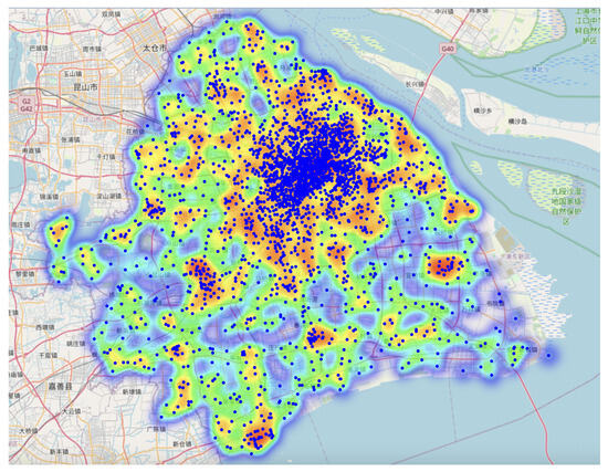Deployment of the 3233 base stations from the dataset over the city of Shanghai.