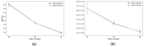 First, a study about latency and workload was conducted using the distributed methodology to ensure that these metrics are not adversely affected by the proposed approach. Table 3 compares the latency and workload results between the serial version and the distributed Spark version for different EDC configurations (20, 30, and 40 EDCs), presenting the latency and workload, along with their standard deviations, for both versions. Additionally, these results are shown in Figure 4 to graphically illustrate the trend of both metrics based on the number of EDCs deployed across the city of Shanghai.