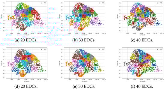 EDC deployments with base stations grouped based on the number of EDCs, using the serial version (a–c) and the proposed methodology (d–f).