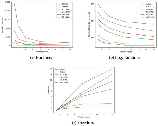 Figure 6a provides a direct representation of execution time as a function of the number of worker nodes, offering a straightforward comparison of how different dataset sizes respond to variations in cluster size. These results reinforce the findings from the logarithmic plot (Figure 6b), further emphasizing the significant reductions in execution time achieved by increasing the number of worker nodes, particularly for larger datasets. For example, with the 5045.5 MB dataset, the execution time decreases markedly as more worker nodes are added. These runtimes demonstrate the algorithm’s capacity to distribute and process large workloads across a distributed cluster effectively.
