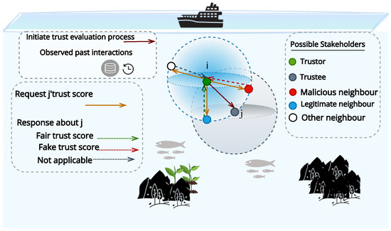 This study explores the trust establishment of the IoUT, which comprises randomly distributed nodes that carry out sensing, data collection, and data relay to the surface base station using a hop-by-hop approach communicating over acoustic channels [11]. In trust management, each node evaluates the reliability of its neighbours using its available information. Figure 1 shows the entities involved in the trust establishment process. The evaluating node is the Trustor node (i), depicted in green, and the evaluated node is the Trustee node (j), depicted in grey. Trust evidence is the data used to calculate trustworthiness, resulting in a trust score from 0 to 1, where 1 means complete trust and 0 means none. The trustor is subject to a lack of evidence to judge the trustee, and therefore, it seeks input from neighbouring nodes. These responses, called recommendations, can come from fair (blue), malicious (red), or uninformed (white) nodes.