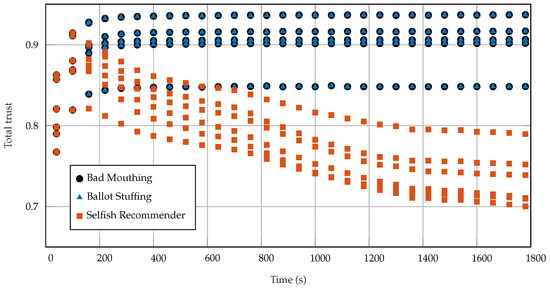 Figure 2. The average trust scored for dishonest recommenders over time obtained by CATM. - In the field of recommender systems, two predominant methods for detecting dishonest recommenders are the Majority Rule-based [17] and the Deviation from Personal Experience-based approaches [15]. While simple and effective in certain contexts, the Majority Rule-based method falls short in scenarios with collaborative attacks, where a dishonest majority can skew the results. It also risks false positives by mislabelling honest recommenders with unique perspectives. On the other hand, the Deviation from Personal Experience-based method, which compares recommendations against individual user experiences following a defined threshold to detect recommendations that deviate from the personal experience and thus is able to isolate unfair negatives and unfair positive recommendations, offers a more personalized assessment. However, it struggles in situations with limited personal experience and is susceptible to the decay of trust over time, especially when lacking direct interactions with certain nodes. Both methods, therefore, while useful in their respective contexts, exhibit distinct limitations that can impact their effectiveness in accurately identifying dishonest recommenders. These two methods have been defined in the literature under what is called endogenous discounting [18]. The inherent fallacy of endogenous discounting highlights the confirmation bias introduced when claims deviating from prior expectations are ignored.