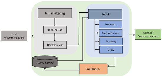 Based on the assumptions we highlighted in Section 4.1, we introduce the belief function, outlined in Algorithm 2, which evaluates the credibility of recommendations by integrating several key factors: freshness, similarity, trustworthiness, and decay. Each factor contributes to the overall belief score, which is used to assess the belief in recommendations.