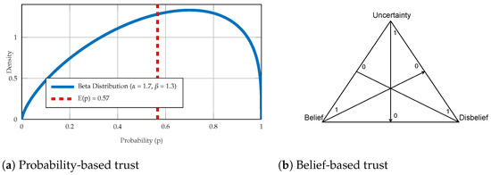 In the literature, two robust models have been extensively utilized to establish trust: the beta-based reputation model [36] and the subjective logic model [37]. Both models are recognized as foundational for assessing trust and reputation, allowing for the quantification of trust with a degree of uncertainty, hence supporting the development of confidence measures. Figure 4 illustrates the representation of each model measurement to construct the trust.