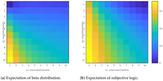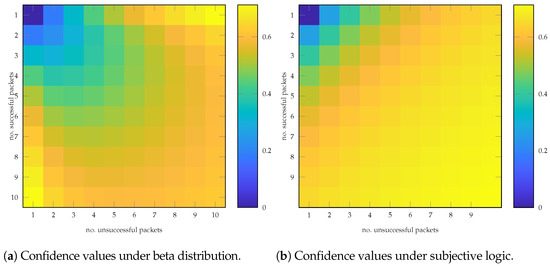 The results of both models utilising Equation (5) are illustrated in Figure 6. In the beta-based model and unlike the previous observations on Figure 6a,b, there is an increase in confidence with more positive interactions and a decrease with more negative interactions, which contrasts with earlier observations. A significant issue with this method is the initially high confidence level despite the absence of prior interaction data. On the contrary, and using the subjective logic method in Figure 6b, the colour gradient demonstrates a more linear decrement in confidence as the number of unsuccessful packets increases while simultaneously maintaining a relatively high number of successful packets. This characteristic implies a significant sensitivity to the ratio of successes to failures within the given sample space.