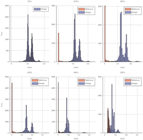 Figure 8 shows how frequently each belief value appears among the nodes, effectively illustrating the impact of varying attack intensities on the belief assignments to benign and malicious nodes. At 0% attack, only benign nodes are present. The histogram for benign nodes (shown in blue) is relatively narrow, indicating a tight distribution around the mean belief. The belief score obtained here reflects the weight assigned by the model to each recommender among the received recommendations, with the variation reflecting the number of recommendations received by nodes and the associated weight assigned to them. This suggests that overall, benign nodes have consistent belief scores under normal conditions, with slight variations depending on the number of recommendations and the factors considered in the computation of the belief model, such as similarity, trustworthiness, and freshness.