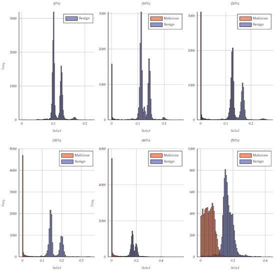As the attack percentage increases from 10% to 50%, the graph displays both benign (blue) and malicious (red) nodes. There is a noticeable shift in the belief assigned to malicious nodes compared to benign ones, with malicious nodes typically receiving lower belief values. This indicates that the proposed model is capturing their altered and potentially disruptive behaviour. The distinction between the blue and red distributions diminishes as the attack percentage rises, highlighting the increasing influence of malicious actions. In the worst-case scenario, with 50% of nodes being malicious, the proposed model reduces the belief scores for the malicious nodes but still faces difficulty in fully separating the distributions compared to less intensive attacks. This challenge arises because when half of the network consists of malicious nodes, their collective influence becomes significant enough to obscure the clear distinction between benign and malicious behaviour.