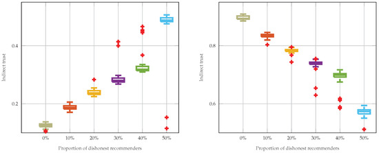 We assess the indirect trust obtained towards targeted nodes by each node in the network following Equation (1). Figure 10 shows the resulting indirect trust across 20 distinct network topologies and varying attack scenarios. For each attack, the indirect trust values are collected, and their distribution is assessed through quartiles (Q1, median, and Q3), highlighting the central tendency and variability. With no attacks, the proposed evaluation of recommendation methods shows a fair weighting of recommendations in both types of attacks (high trust scores for benign nodes exhibited in Figure 10b during bad-mouthing attacks and low trust scores for malicious nodes being promoted in Figure 10a during ballot-stuffing attacks). It also shows resistance to attacks during the increase in the attack percentage. Among trials, we noticed some outliers, which are mainly due to changes in the environment and simulation settings.