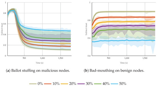 Evaluation of the obtained indirect trust over trails (for each percentage, there are 115 data points (mean values), resulting in a total of 20,550 individual indirect trust values per attack type).