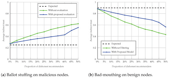 As depicted in Figure 12b, during bad-mouthing attacks, the trustworthiness of normal nodes declines as the number of malicious nodes increases. Similarly, in ballot-stuffing attacks, shown in Figure 12a, the trust value of malicious nodes increases with their numbers, but the changes within our proposed method remain manageable. This is because, without a filtering mechanism, each recommendation node is assigned the same weight, leading evaluating nodes to accept all propagated recommendation values indiscriminately. Consequently, as the proportion of malicious nodes increases, the dissemination of false information in the recommendation sequence escalates, significantly impacting the final trust value. In contrast, the recommendation evaluation method discussed in this paper adjusts recommendation trust values based on various attributes after filtering the recommendation received.