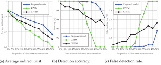 First, we evaluate the average indirect trust of nodes under dishonest recommendation attacks. We aim to examine the average recommendation trust under varying proportions of dishonest recommenders. All models exhibit some resistance to dishonest recommendations when the proportion of malicious recommendations is small. However, as the proportion of malicious nodes increases, the performance of each model fluctuates in terms of resistance to dishonest recommendations. Specifically, in Figure 13a, under ballot-stuffing attacks, CATM shows less resistance as the percentage of dishonest recommenders in the network increases. This is because CATM’s validation process focuses on the performance of recommenders without accounting for the deception of recommender nodes. Conversely, CFFTM demonstrates high resistance to the attack due to its filtering technique, as explained earlier. Our proposed model provides more accurate detection of attacks, even as the percentage of malicious nodes increases. Figure 14a illustrates the resulting average indirect trust under bad-mouthing attacks in the same setting, where the nodes under attack are promoted as malicious. The proposed model excels in detecting dishonest recommendations, resulting in consistently high trust towards the evaluated nodes. As expected, an increase in the number of malicious nodes challenges all models’ ability to detect dishonest recommendations, yet the proposed model remains within a manageable range.