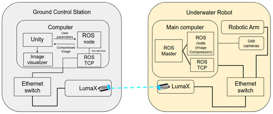Figure 1 shows the communications diagram, where the ground control station and the underwater robot communicate through the VLC. In the GCS, a computer runs the Unity-based HRI, where the operator visualizes the images and, at the same time, changes the operation mode and parameters of image transmission. The Unity-based HRI is connected to an ROS node using the ROS-TCP-Endpoint package [21], which allows for communication between Unity scripts (programmed in C Sharp) and the ROS network congestion control node (programmed in C++). From the Unity script, a topic is published, and in the ROS node, this topic is read, using this information to change the operation mode. The ROS node runs the control algorithm and consistently requests ROS services from the underwater robot’s main computer. ROS communications are performed by ROS TCP, which is a transport layer for ROS messages and services that uses the standard TCP/IP sockets to transport message data. The GCS computer is connected to an Ethernet switch, and taking advantage of the transparency of the VLC link, a connection with the underwater robot can be established.