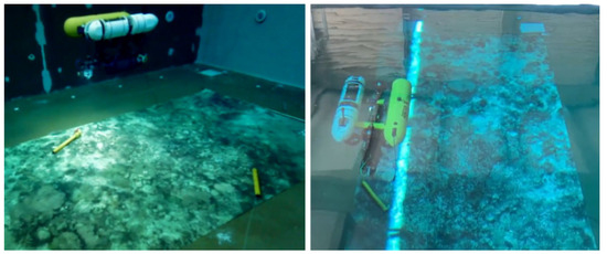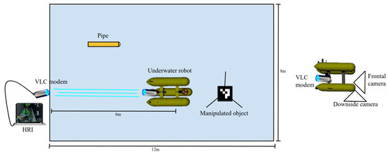 The experiments were conducted at the Research Centre for Robotics and Underwater Technologies (CIRTESU), Castellon de la Plana, Spain where there is a water tank with dimensions of 8 × 12 × 5 m and a control station next to it. From the control station, the tank is visible through the glass, allowing the light of the VLC modem to pass through and communicate with the one fixed on the underwater robot. Figure 4 shows a top-view diagram of the experimental setup in the CIRTESU tank.