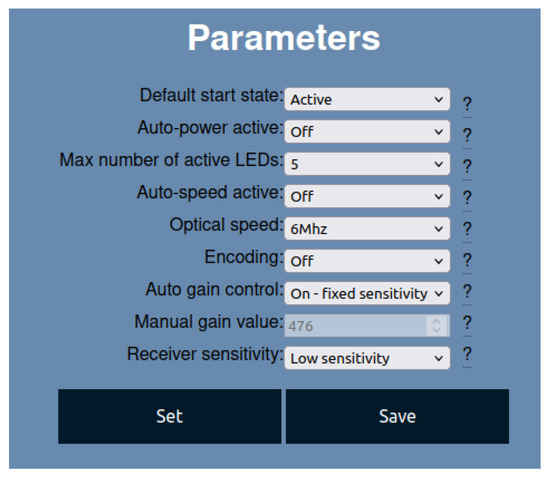 Configuration parameters of the VLC modem (LumaX) were selected to demonstrate the best performance in a water-tank environment with moderate lighting and a short distance of less than 12 m. These parameters are shown in Figure 5. The optical speed used for the four experiments was 6 MHz.